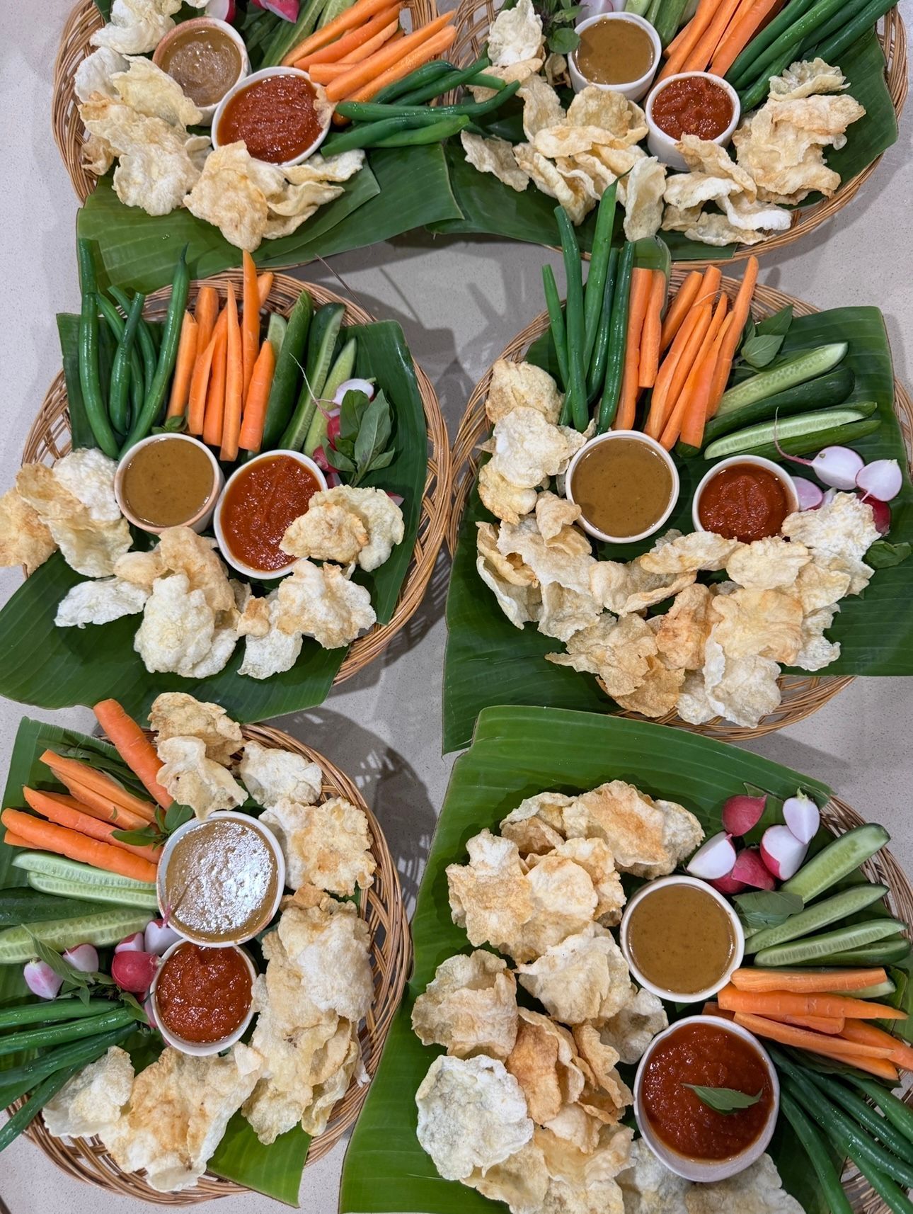 Kerupuk melinjo seed crackers with tomato, chilli sambal and peanut sauce with vegetable crudities